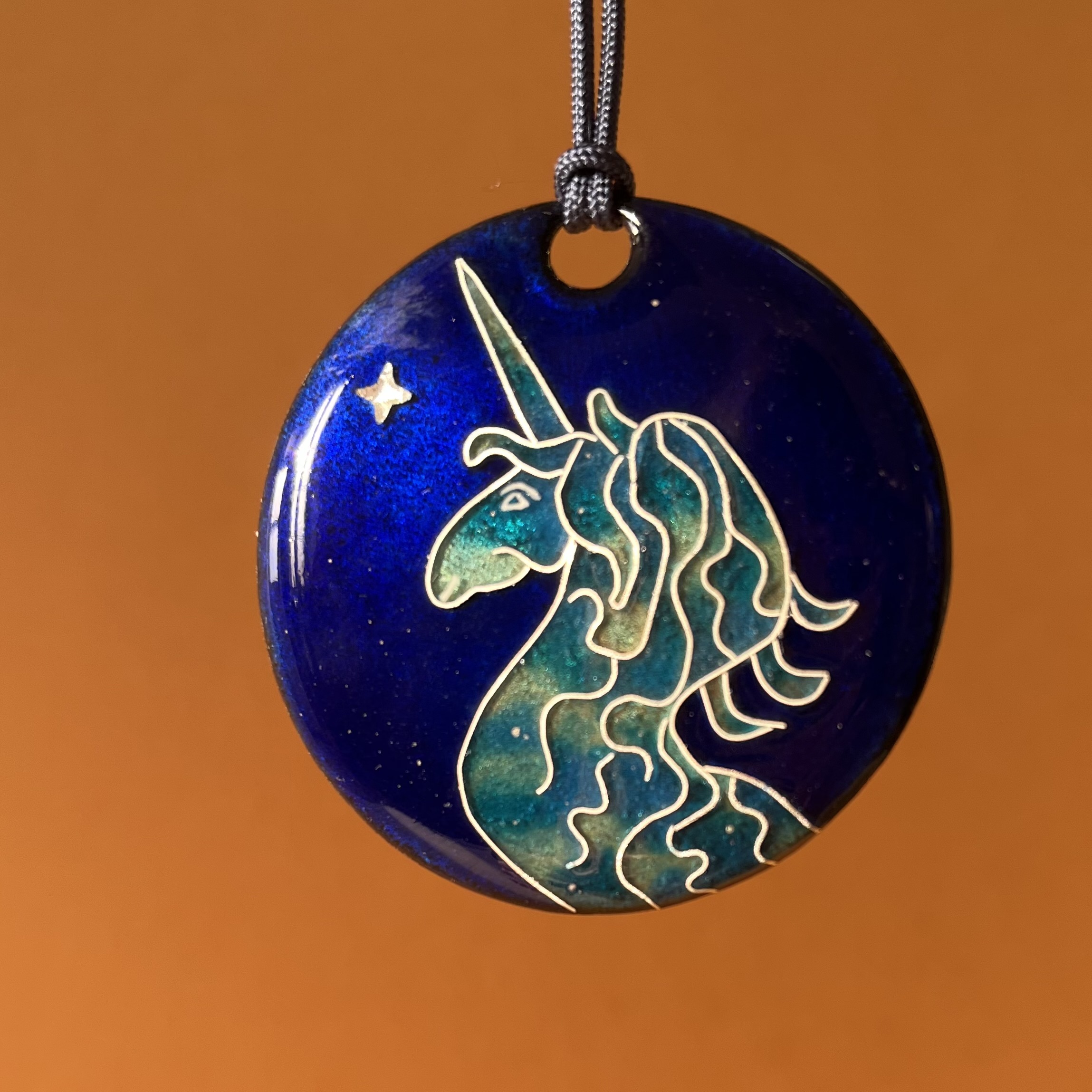 Pendentif Licorne bleue en émaux sur cuivre cloisonnés